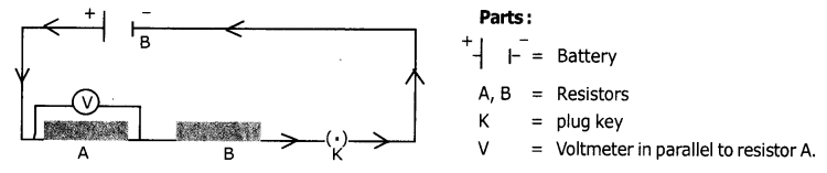 Draw a circuit diagram for a circuit in which two resistors A and B are connected in series with a battery and a voltmeter is connected to measure the potential difference across the resistor A.